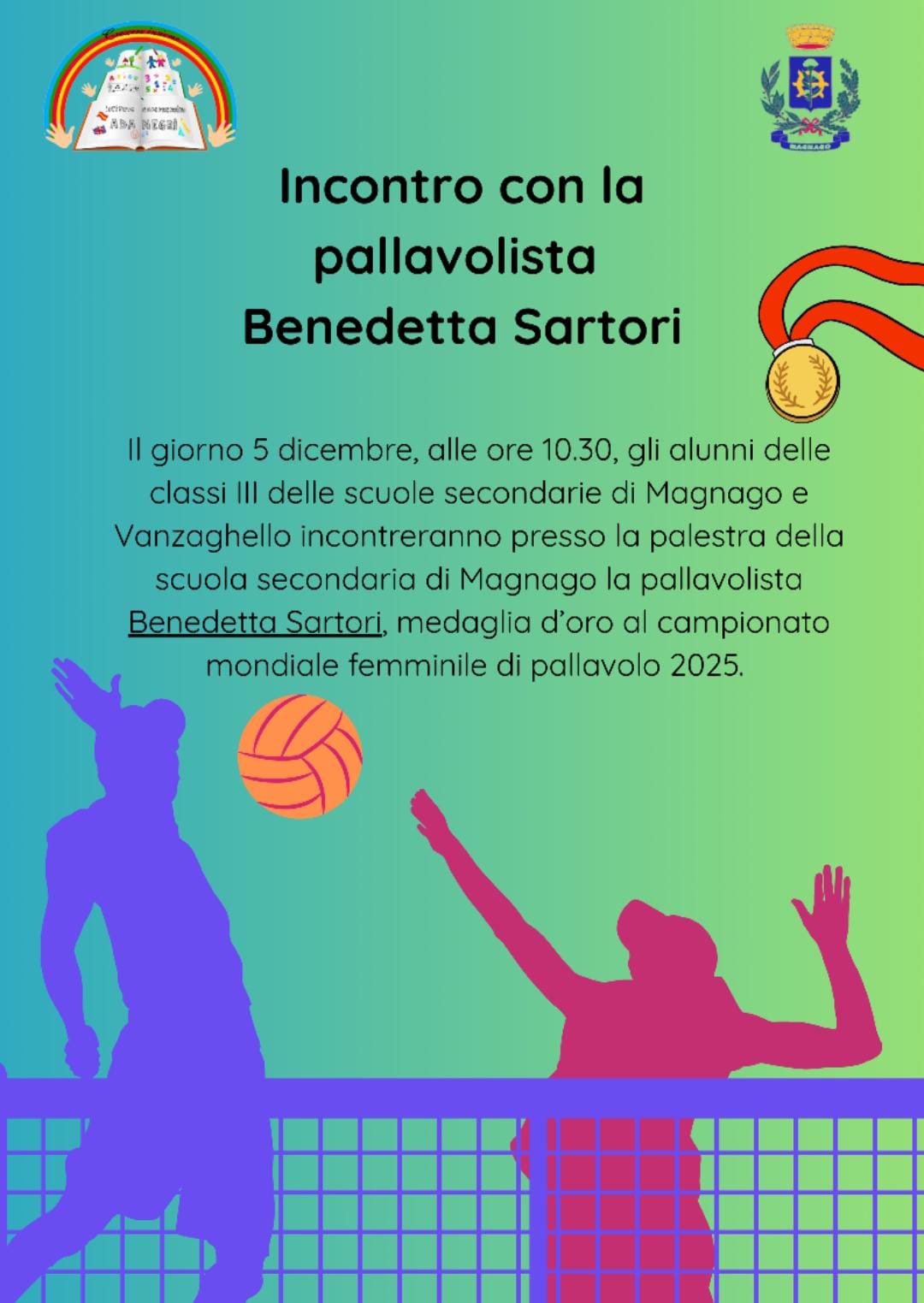 Il 5 dicembre, alle ore 10.30, gli alunni delle classi terze delle scuole secondarie del nostro Istituto incontreranno la pallavolista Benedetta Sartori della nazionale di pallavolo italiana, medaglia d’oro al campionato mondiale femminile di pallavolo 2025, allenata dal grande Julio Velasco.