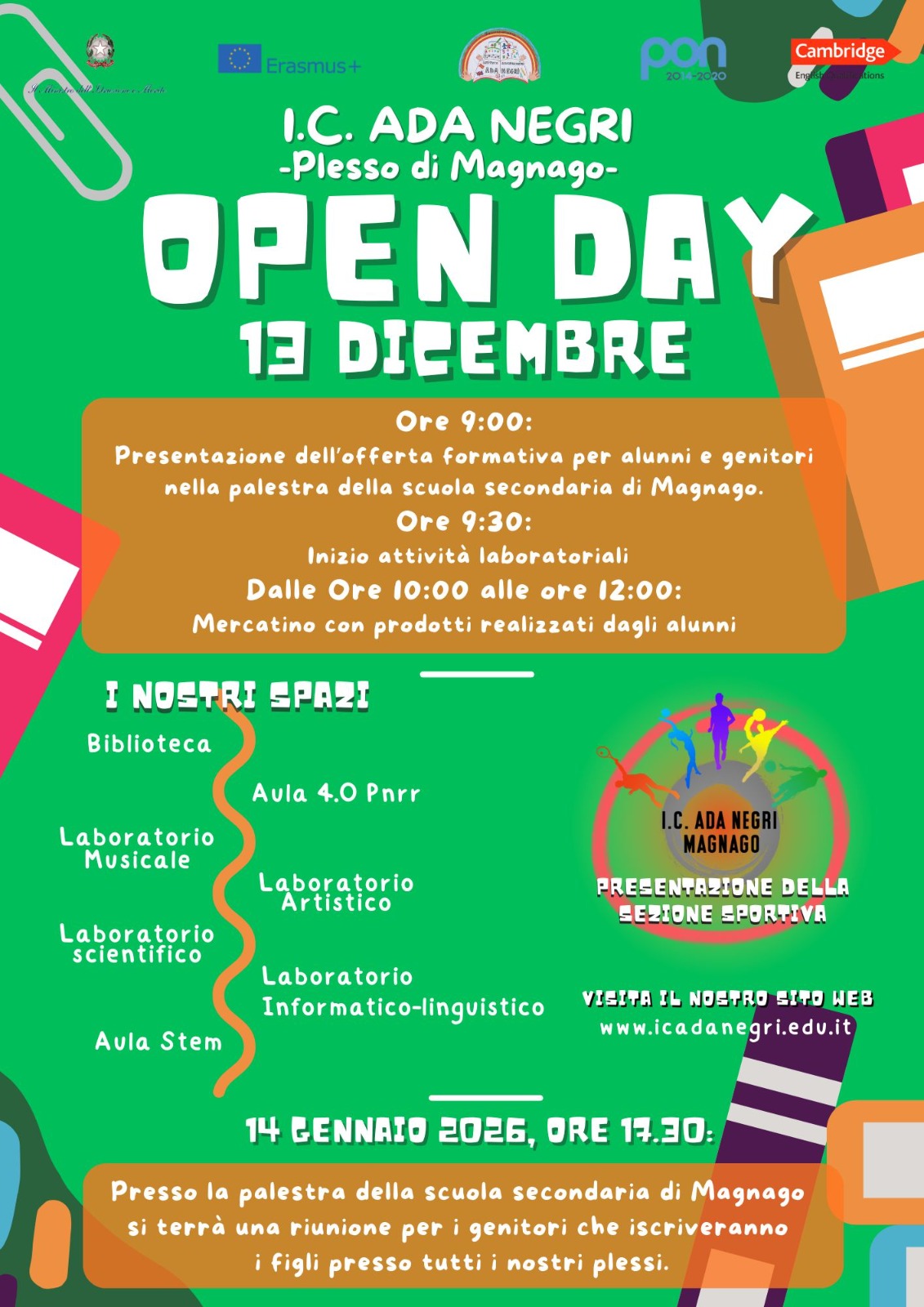 Le scuole secondarie dell’I.C. Ada Negri invitano a partecipare all’Open day che si terrà il 13 dicembre, un’occasione speciale pensata per accogliere studenti e famiglie desiderosi di conoscere da vicino l’offerta formativa, i docenti e le attività che caratterizzano la nostra scuola. Durante l’evento sarà possibile visitare gli ambienti scolastici, partecipare a laboratori didattici, incontrare gli insegnanti e ricevere tutte le informazioni necessarie sull’organizzazione delle lezioni, i progetti e tanto altro…